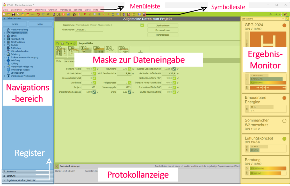 Die Benutzeroberfläche von EVEBI unterteilt sich in mehrere Bildschirmbereiche: Links der Navigationsbereich, mittig die Dateneingaben bzw. Ergebnisse und rechts der Ergebnis-Monitor. Durch Klicken der Register Gebäudedaten, Varianten, Beratung und Ergebnisse können Sie zwischen verschiedenen Aufgabenbereichen wechseln.