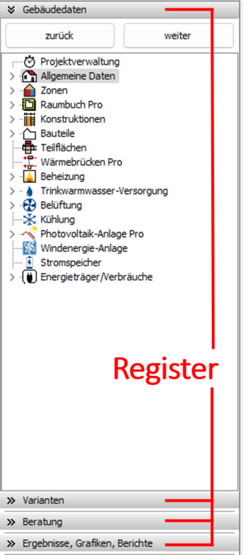 Das Bild zeigt Ihnen ein Beispiel für den Navigationsbereich auf dem Register Gebäudedaten: