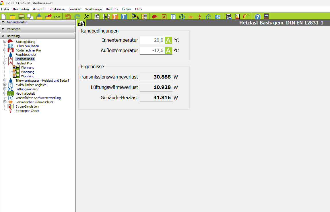 - Ergebnisse: Auf der Grundlage der Projektdaten werden die Transmissionswärmeverluste, Lüftungswärmeverluste sowie die Gebäudeheizlast ermittelt und angezeigt.