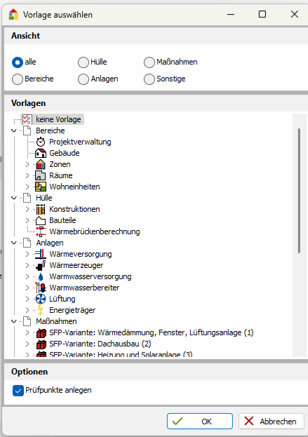 Wählen Sie die gewünschte Vorlage und bestätigen Sie den Dialog mit OK. Komponenten und Prüfpunkte werden generiert und können bearbeitet werden.