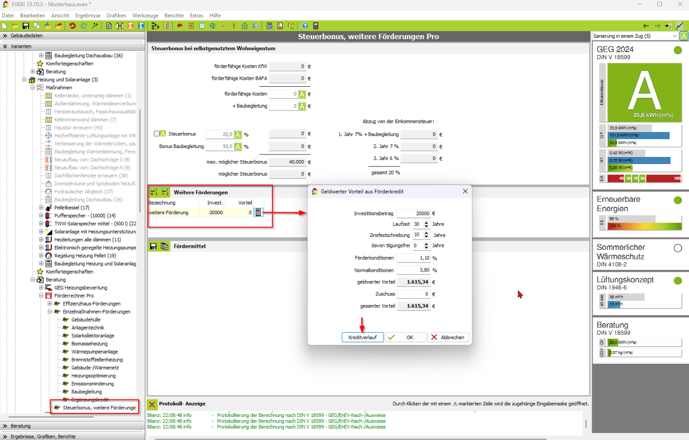 - Wählen Sie im Navigationsbereich die gewünschte Variante und klicken Sie innerhalb der Variante auf den Eintrag FÖRDERRECHNER PRO--> STEUERBONUS/WEITERE FÖRDERUNGEN. Es erscheint die zum Förderprogramm zugehörige Maske.