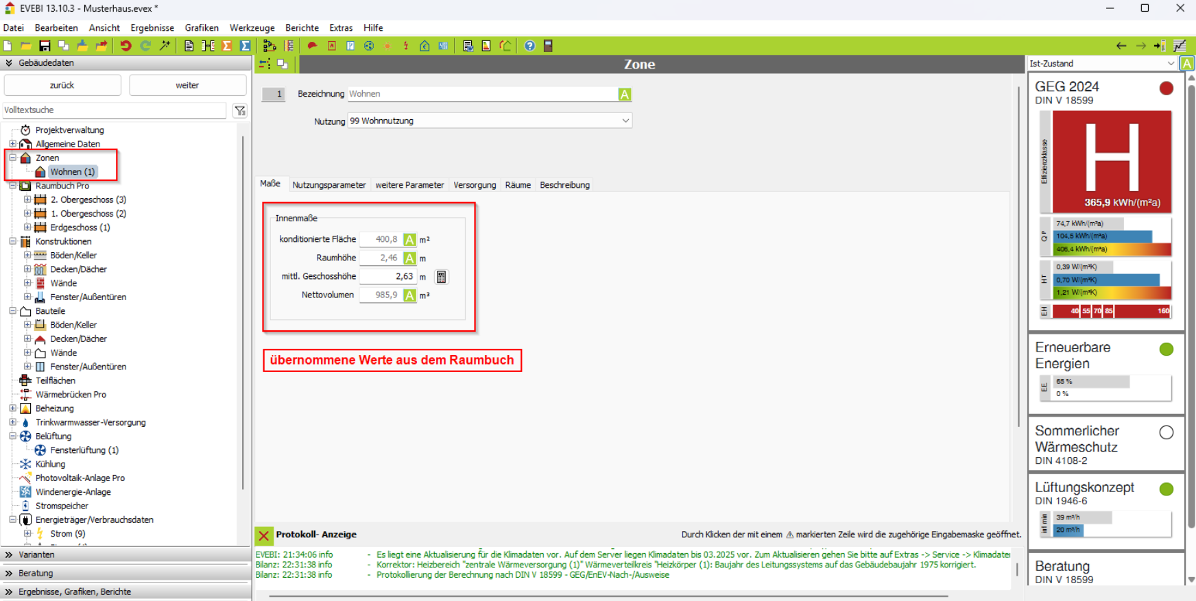 Hinweis: Die in den Zonen anzugebende konditionierte Fläche, Raumhöhe und Nettovolumen werden aus dem Raumbuch übernommen.