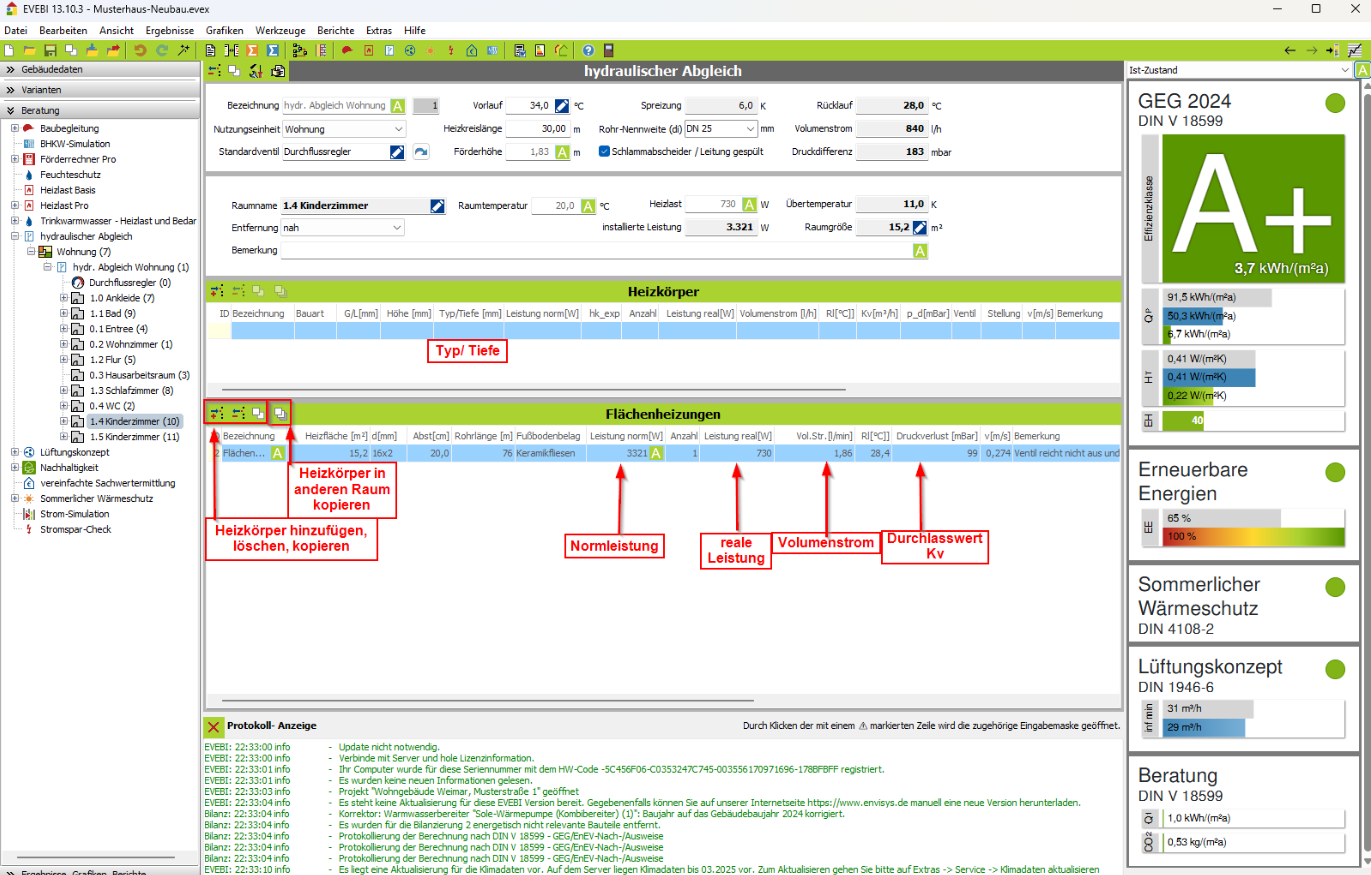 Passen Sie die Heizkörperdaten soweit an, dass eine möglichst geringe Übertemperatur und gleichmäßige Spreizung in allen Räumen erreicht wird.