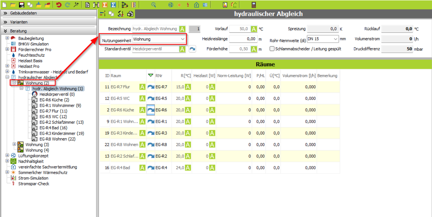 Nutzungseinheit: Die Angabe der Nutzungseinheit ermöglicht die Betrachtung von Teilbereichen des Gebäudes (z.B. Wohnungen, Praxen etc.). Der hydraulische Abgleich wird immer für eine Nutzungseinheit oder für das gesamte Gebäude durchgeführt.