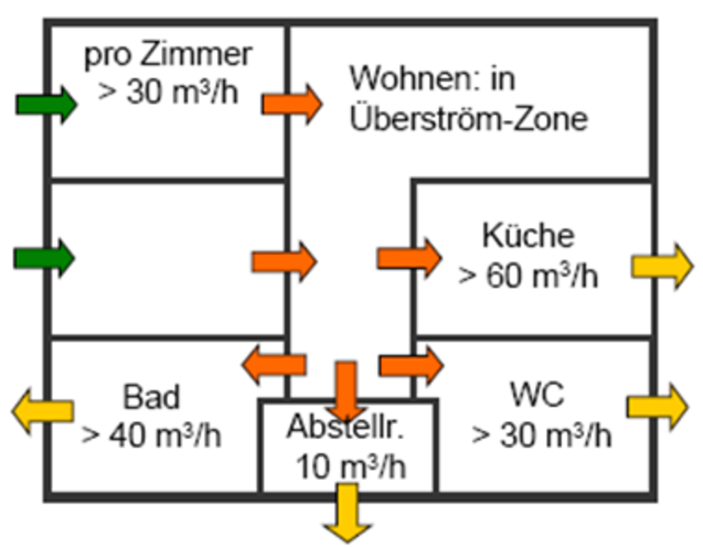 - Ablufträume erhalten das Mindestaußenluftvolumen ggf. über Überströmräume aus Zulufträumen.