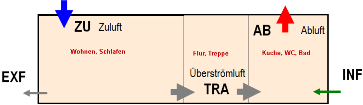 - Überströmraum: Raum in der Nutzungseinheit, der sich strömungsmäßig zwischen Zuluft- und Ablufträumen befindet.
