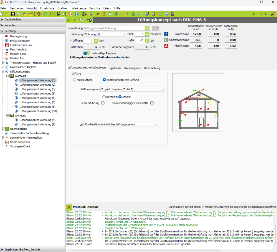 Sind zu einem Wohngebäude Räume mit Ihrer Nutzung, Größe etc. angelegt worden, so können zu einer Nutzungseinheit ein oder mehrere Lüftungskonzepte erstellt werden.