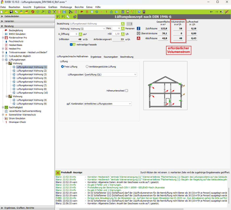 Der Überströmdurchlass in m³/h gibt den Volumenstrom an, welcher zwischen den Räumen gewährleistet werden muss. Die Umsetzung dieser lüftungstechnischen Maßnahmen kann z.B. ein Unterschlitz/Spalt in der Tür sein. 6. Geben Sie den Lüftungskonzept-Bericht aus: