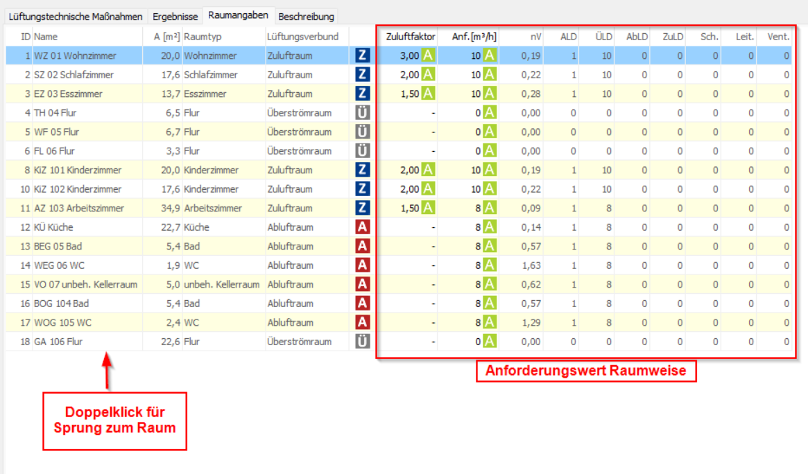 Diese Ergebnisse beziehen sich auf die gesamte Nutzungseinheit (Wohnung) und weicht daher in der Regel von den Ergebnissen in der oberen Maske ab, welche sich auf die einzelnen Räume beziehen (Summe der Volumenströme der Räume). Hinweise * Bei Nutzerunterstützung Bemessung nach Feuchteschutz (FL) Pflicht * Bei Querlüftung Bemessung nach Reduzierter Lüftung (RL) Pflicht * Bemessung nach Nennlüftung (NL) empfohlen * Beim Lüftungskonzept: Querlüftung zum Feuchteschutz erscheint das Ergebnis nur für die Feuchtelüftung (FL) Raumangaben zur freien Lüftung 5. Wechseln Sie auf das Register RAUMANGABEN: (siehe Bild)