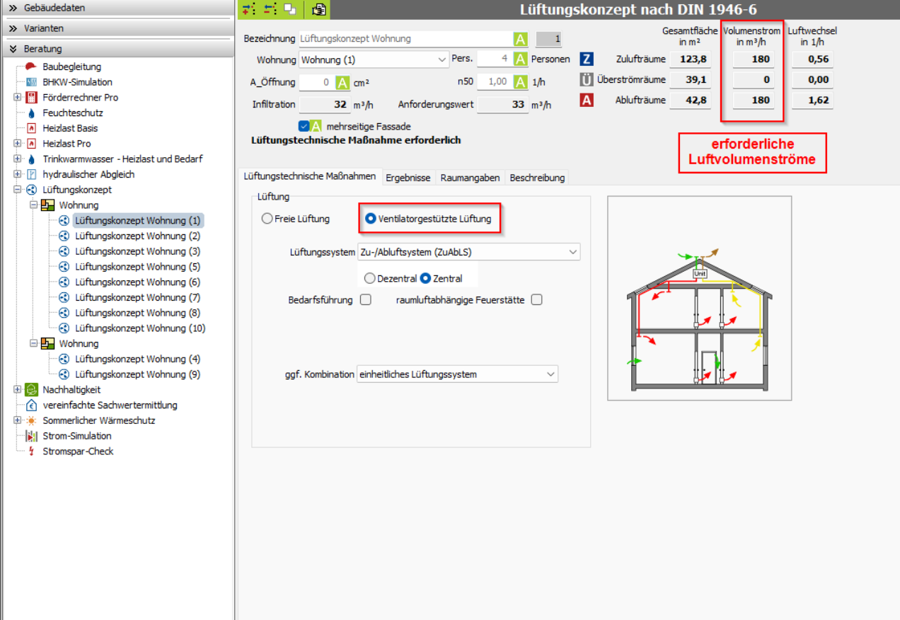 Ventilator (Vent.) wie Leitung; bei dezentralen ist dies für die Dimensionierung des Gerätes notwendig. 9. Geben Sie den Lüftungskonzept-Bericht aus.
