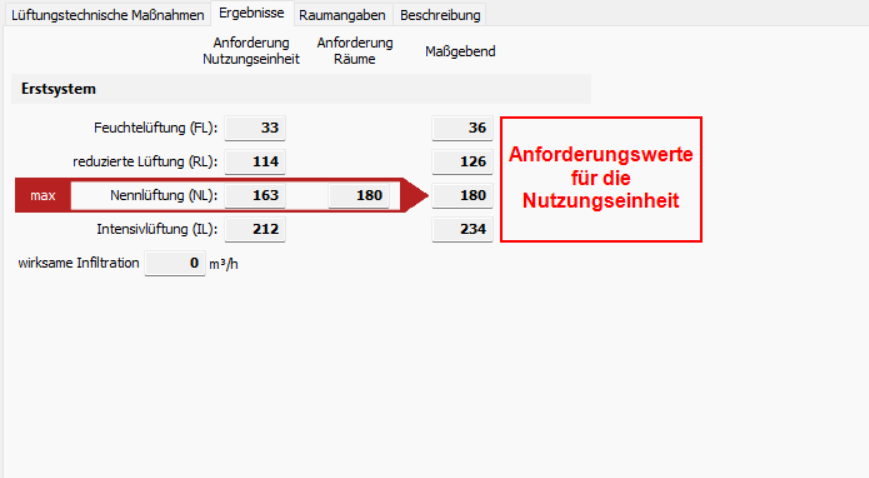 Hier sehen Sie die Anforderungen an die Volumenströme und die Luftwechselrate für die Feuchtelüftung (Mindestanforderung für Infiltration), reduzierte Lüftung (hygienischer Luftwechsel bei Abwesenheit) und Nennlüftung (Anwesenheit).