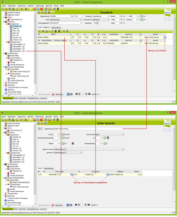 In der Raumbuchmaske können Sie durch Klicken auf das Symbol im Bauteilfeld zum Bauteil in der Bauteilmaske springen.