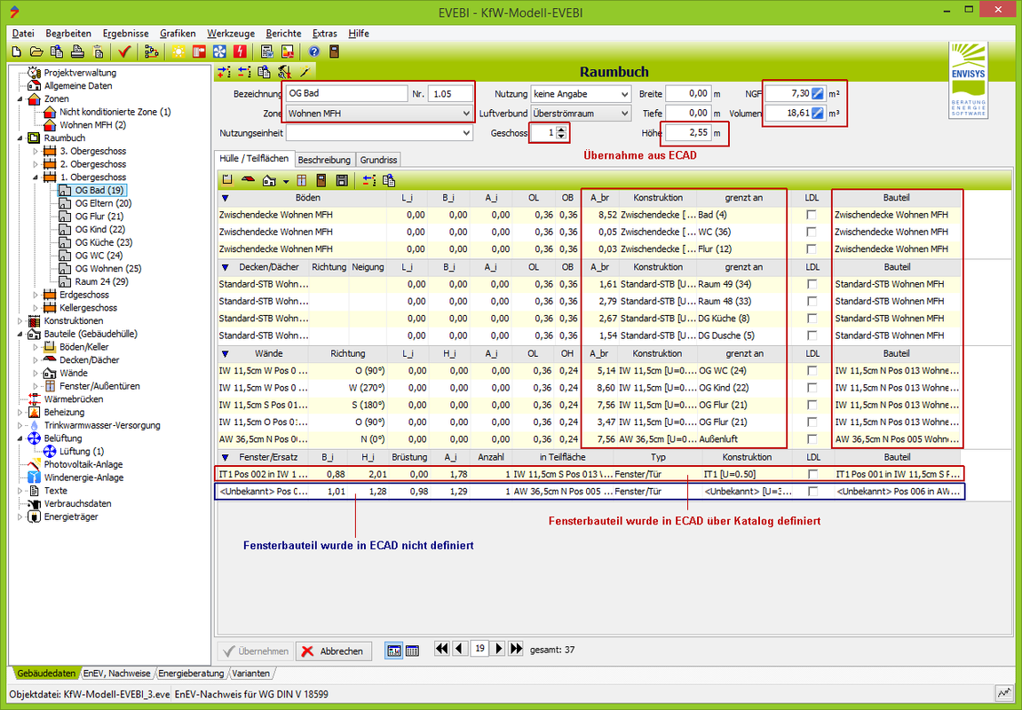 - In Abhängigkeit der Aufbereitung der Daten in E-CAD werden in EVEBI Konstruktionen angelegt. Die Bezeichnung und der U-Wert werden aus den zugeordneten Katalogdaten zu den Bauteilen in E-CAD übernommen.