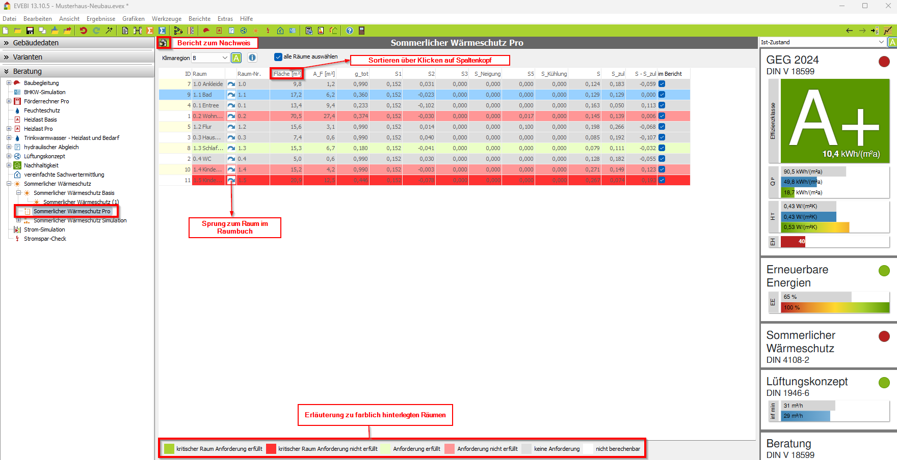 Wird der sommerliche Wärmeschutz (rot dargestellte Räume) nicht erreicht, so sind Nachbesserungen erforderlich, um den Sonneneintragskennwert zu senken.