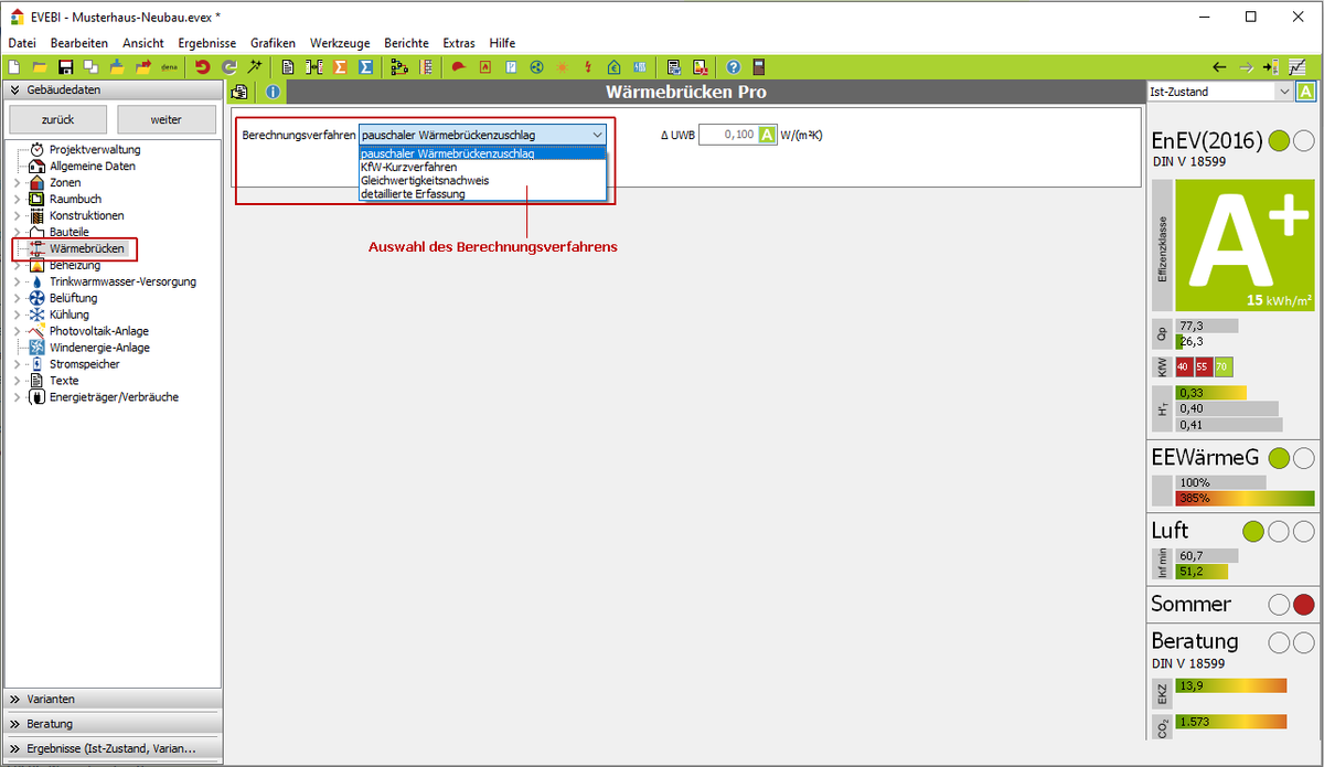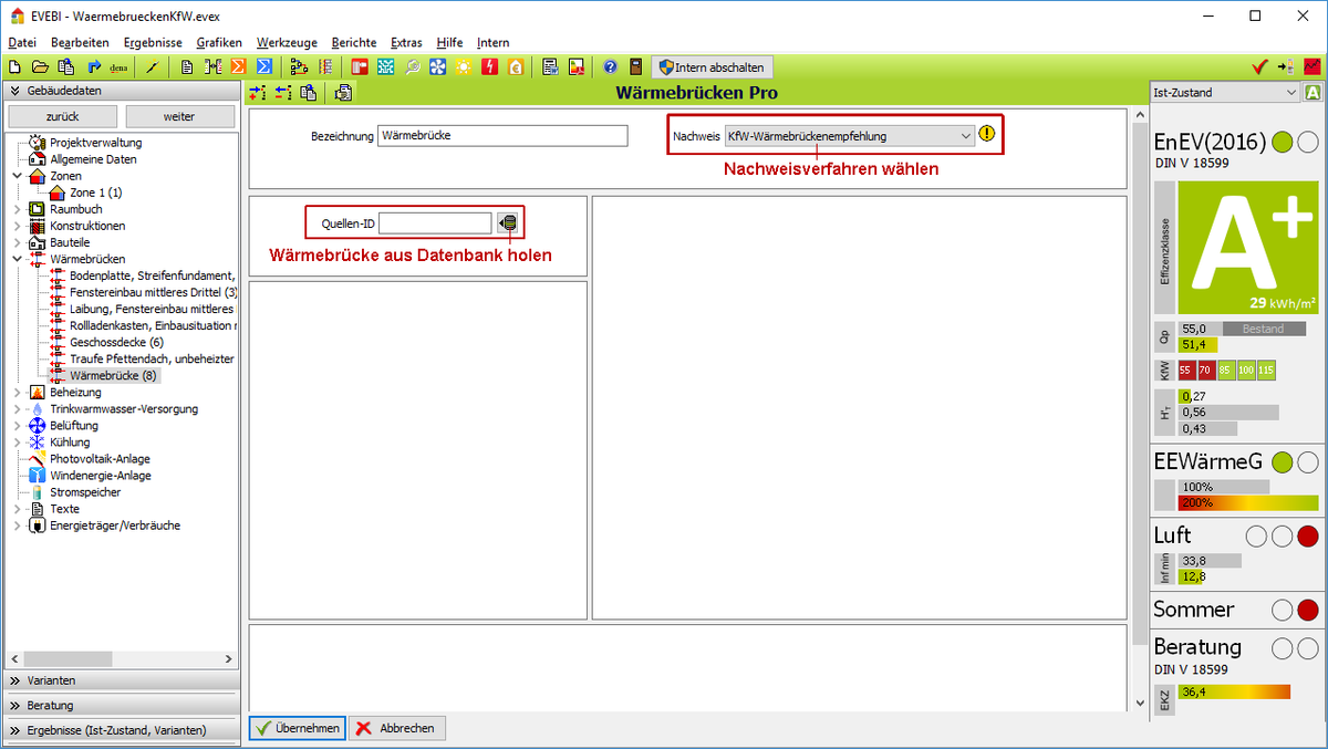 - Berechnung der Wärmebrücken extern (z.B. ThermCAD »), Import nach EVEBI