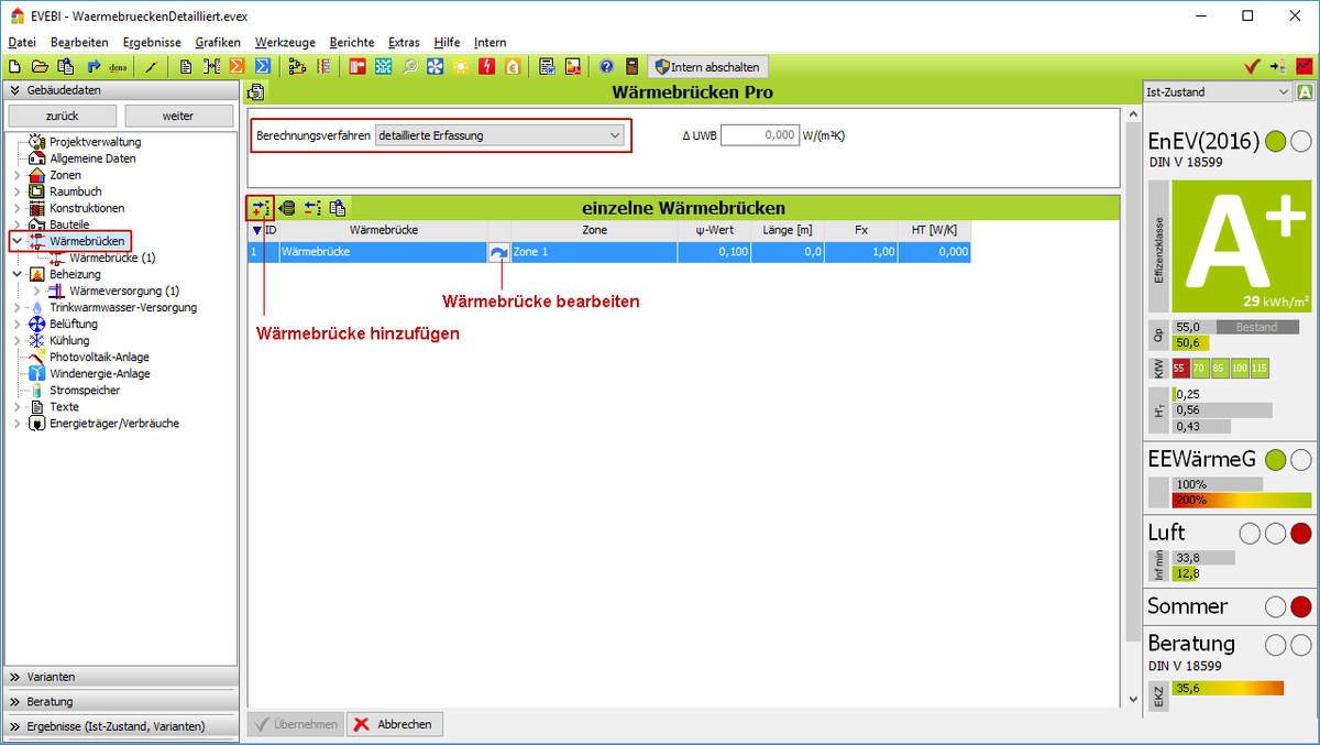 - Wählen Sie unter dem Register GEBÄUDEDATEN den Eintrag WÄRMEBRÜCKEN.