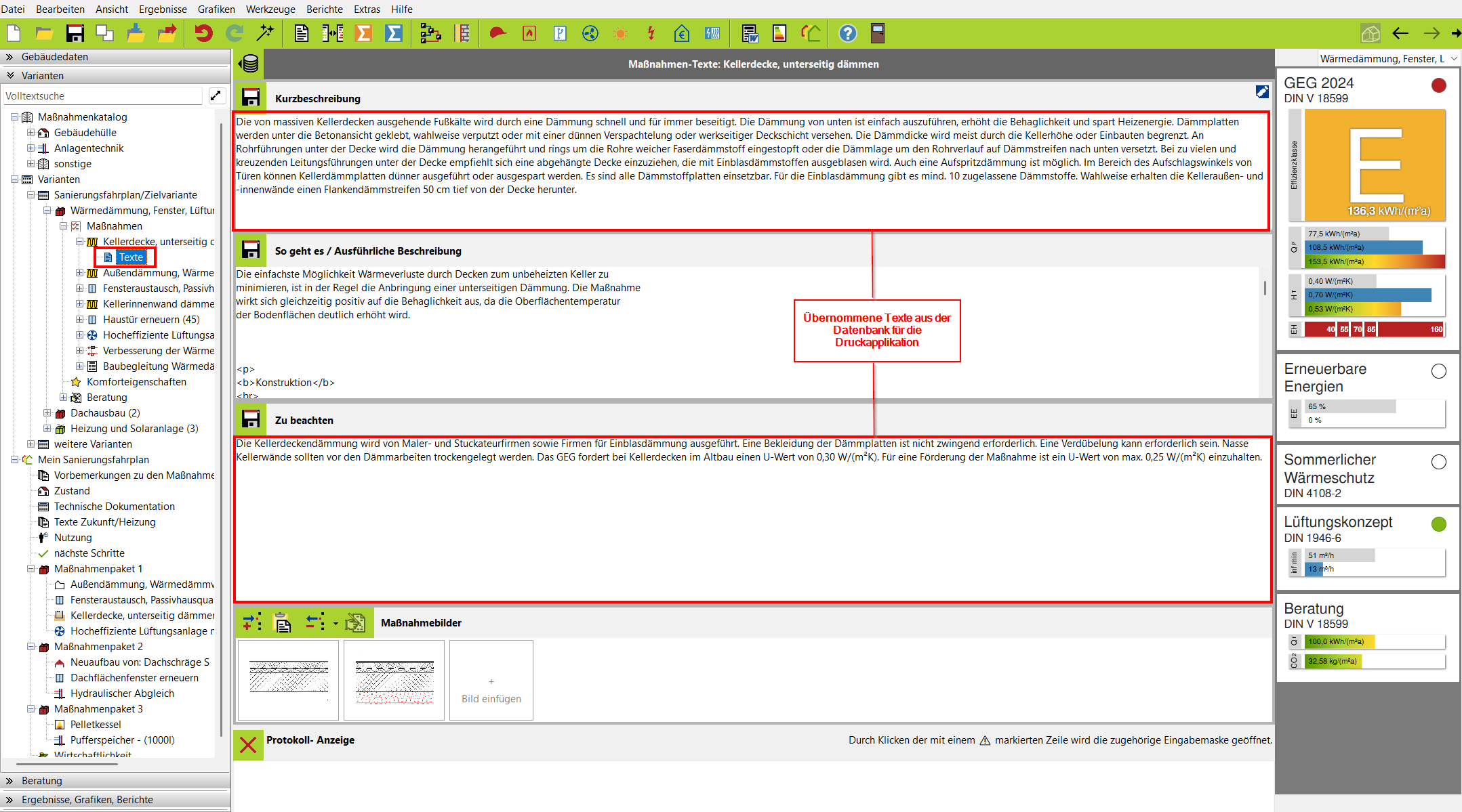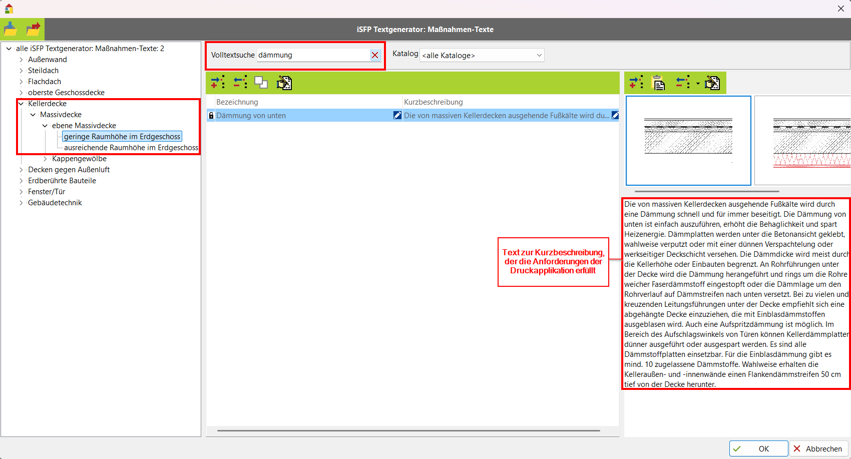Mit dem iSFP Textgenerator in EVEBI haben Sie die Möglichkeit gezielt Texte zur Maßnahmenbeschreibung aus der Datenbank abzurufen, die den Textanforderungen der Druckapplikation entsprechen und nicht mehr nachbearbeitet werden müssen.