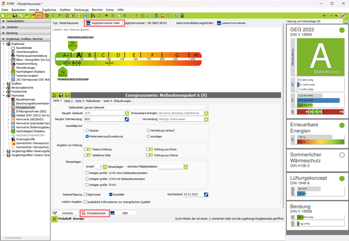 Energieausweis: Energieausweis nach GEG im Original (mit Registriernummer) bzw. in der Vorschau (ohne Registriernummer) im pdf-Format. Diese Datei wird von der GEG-Druckapplikation erzeugt und ist für die Übergabe an den Kunden gedacht.