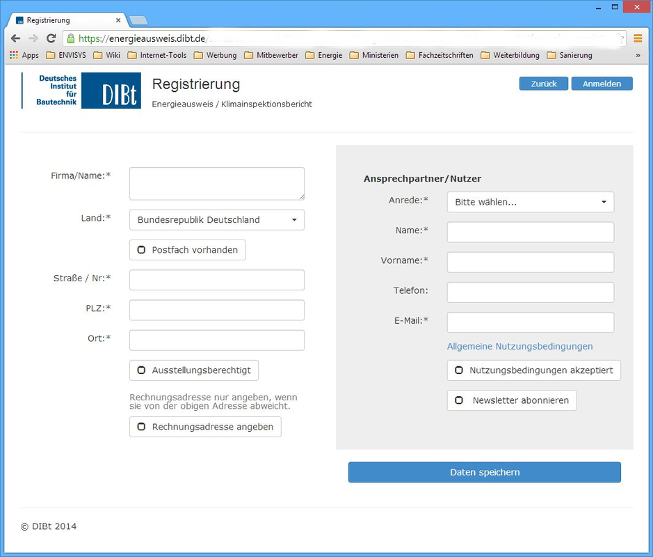 In diesem Dialog können Sie Ihre Ausstellerdaten eingeben und über die Schaltfläche DATEN SPEICHERN beim DIBt speichern.