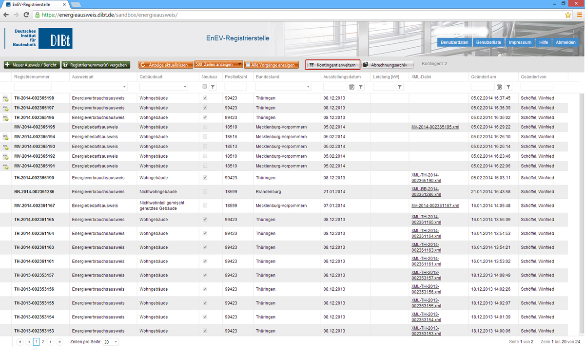 Hier sehen Sie alle von Ihnen bereits beim DIBt registrierten Energieausweise. Bei einer Erstanmeldung sind natürlich noch keine Ausweise vorhanden.