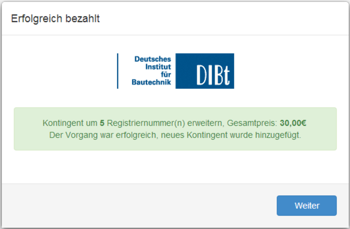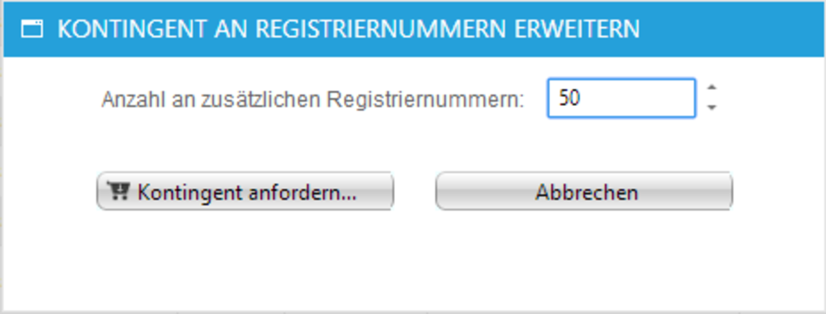 - Geben Sie die Anzahl der gewünschten Registriernummern an und klicken die Schaltfläche KONTINGENT ANFORDERN. Es erscheint der folgende Dialog: siehe Bild