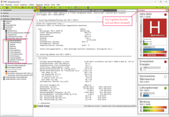 Es erfolgt die Ausgabe sämtlicher Berechnungsergebnisse nach DIN V 18599. Die Ergebnisse werden thematisch sortiert nach der Gebäudeaufteilung, Belüftung, Beleuchtung etc. Neben den Gesamtergebnissen werden die Monatswerte mit ausgegeben.