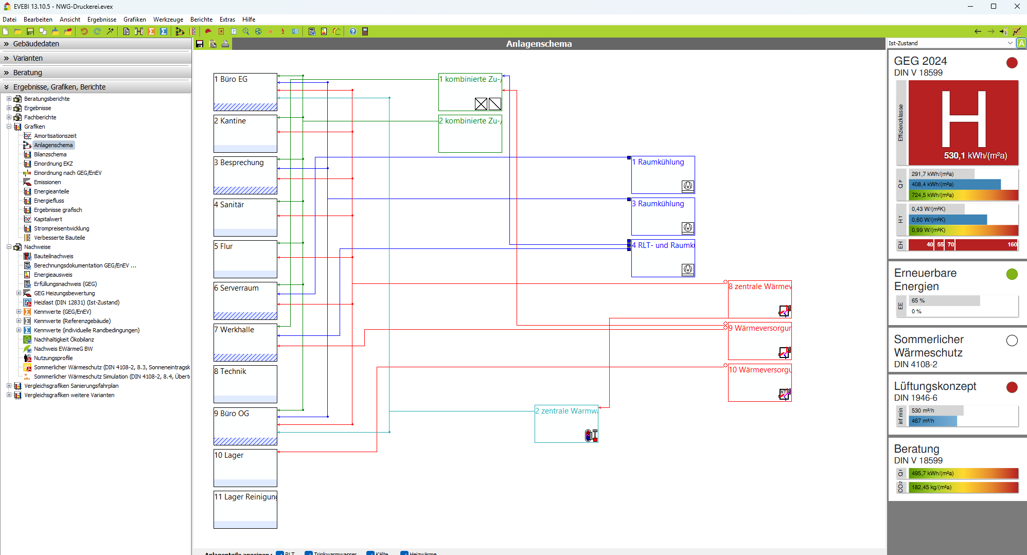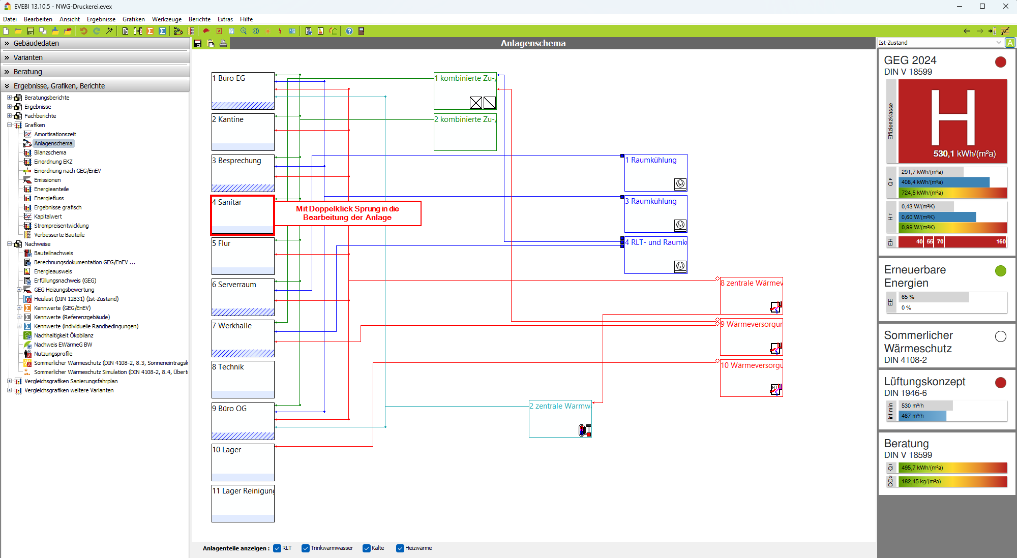 Das Anlagenschema gibt Ihnen einen Überblick über die erfassten Anlagen des Gebäudes. Die Anlagen werden dazu entsprechend ihrer Zuordnung zu Zonen grafisch dargestellt.