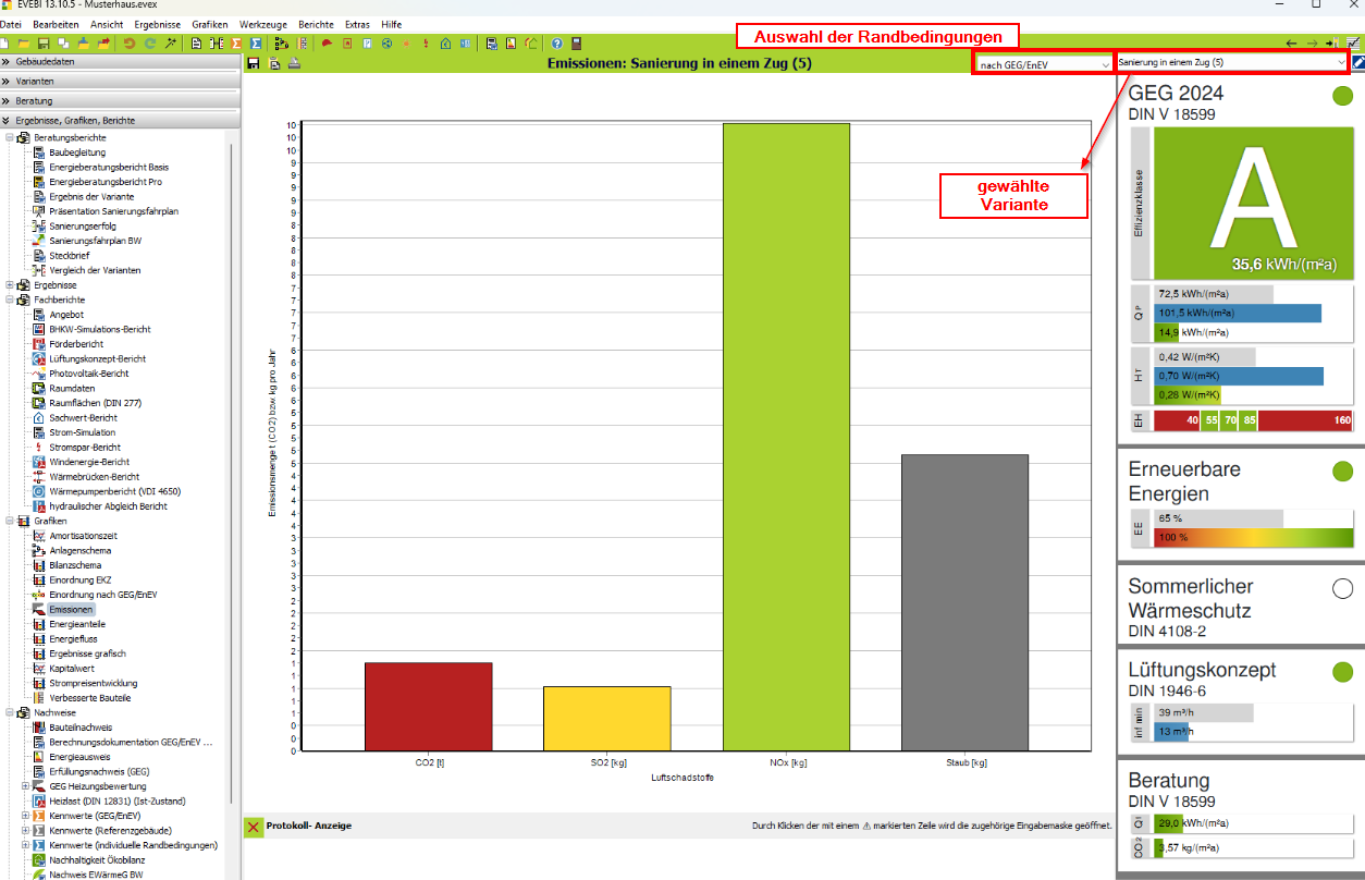 - Sie können bei dieser Grafik zusätzlich wählen, ob die Ausgabe nach GEG, mit freien Randbedingungen oder für das Referenzgebäude erfolgen soll.
