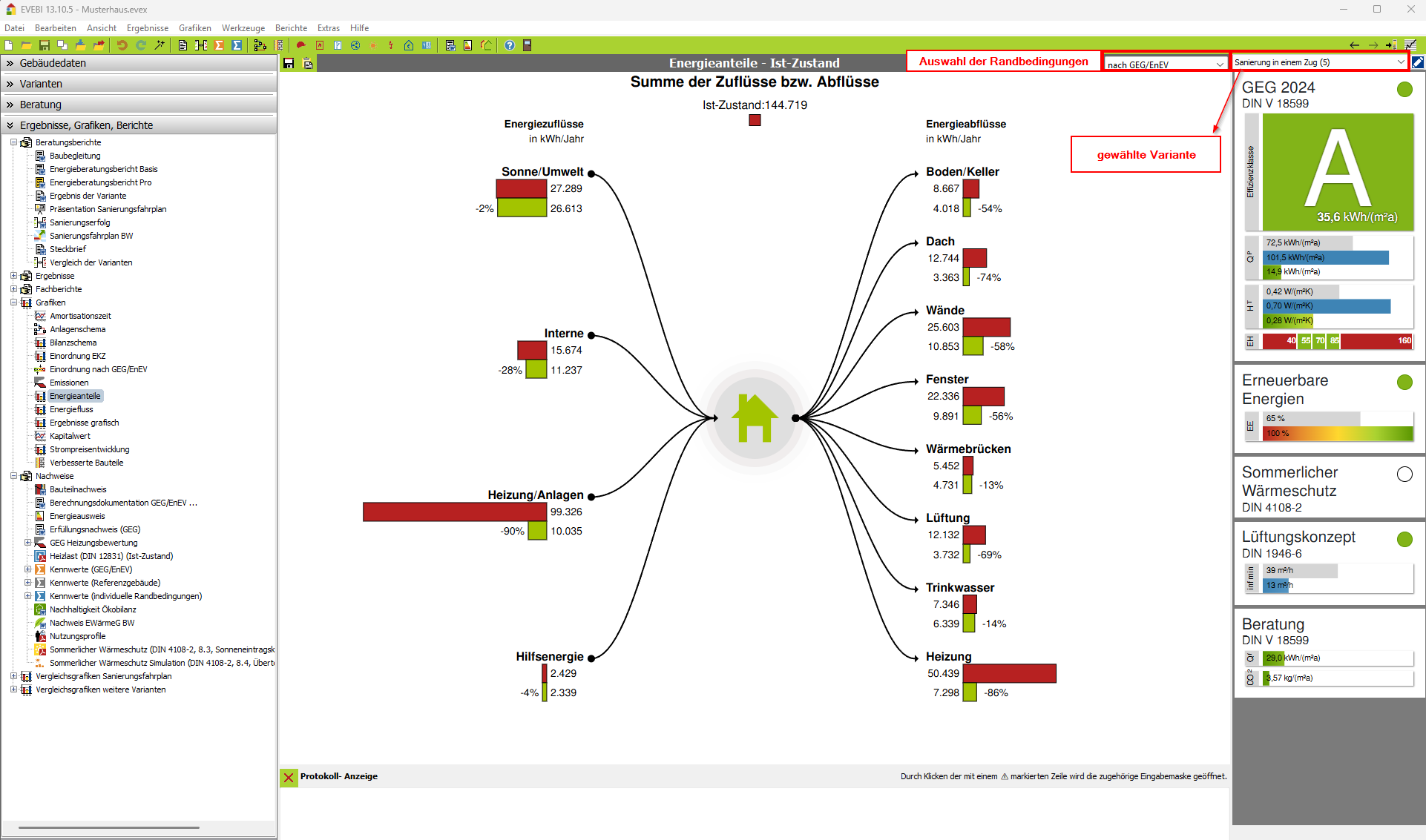 Diese Grafik dient auch zu Vergleichen mit Varianten. Die Grafik zeigt dann die Energiezu- und Energieabflüsse der aktuellen Variante im Vergleich mit dem Ist-Zustand. Hier kann auf einen Blick die Energieersparnis der Variante gegenüber dem Ist-Zustand gesehen werden. Dazu werden die Energieanteile für die Transmissionen durch die Decke, Außenwände, Fenster und Keller sowie Verluste durch Lüftung, Warmwasser und Heizung. Zusätzlich wird die Energieersparnis angezeigt.