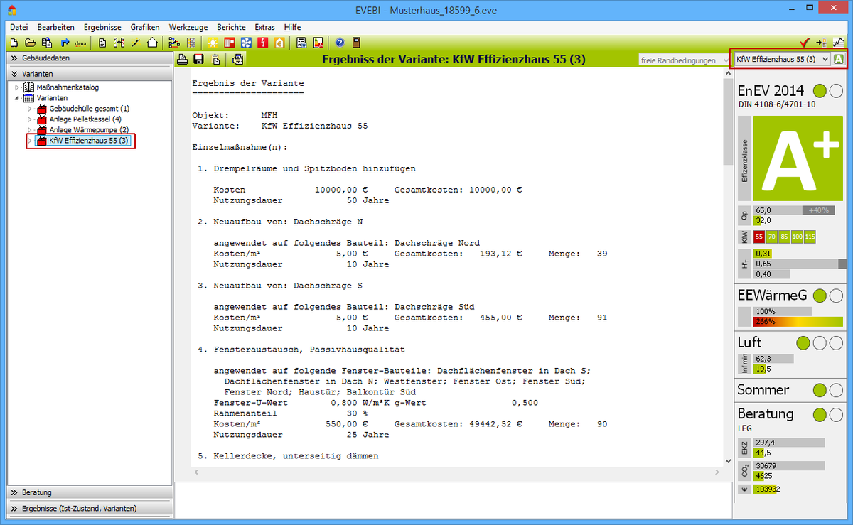 Das Ergebnis der Variante verschafft Ihnen einen Überblick über die verwendeten Maßnahmen mit ihren Kosten und Nutzungsdauer sowie die energetischen Einsparung der Variante einschließlich Wirtschaftlichkeitsbetrachtung.
