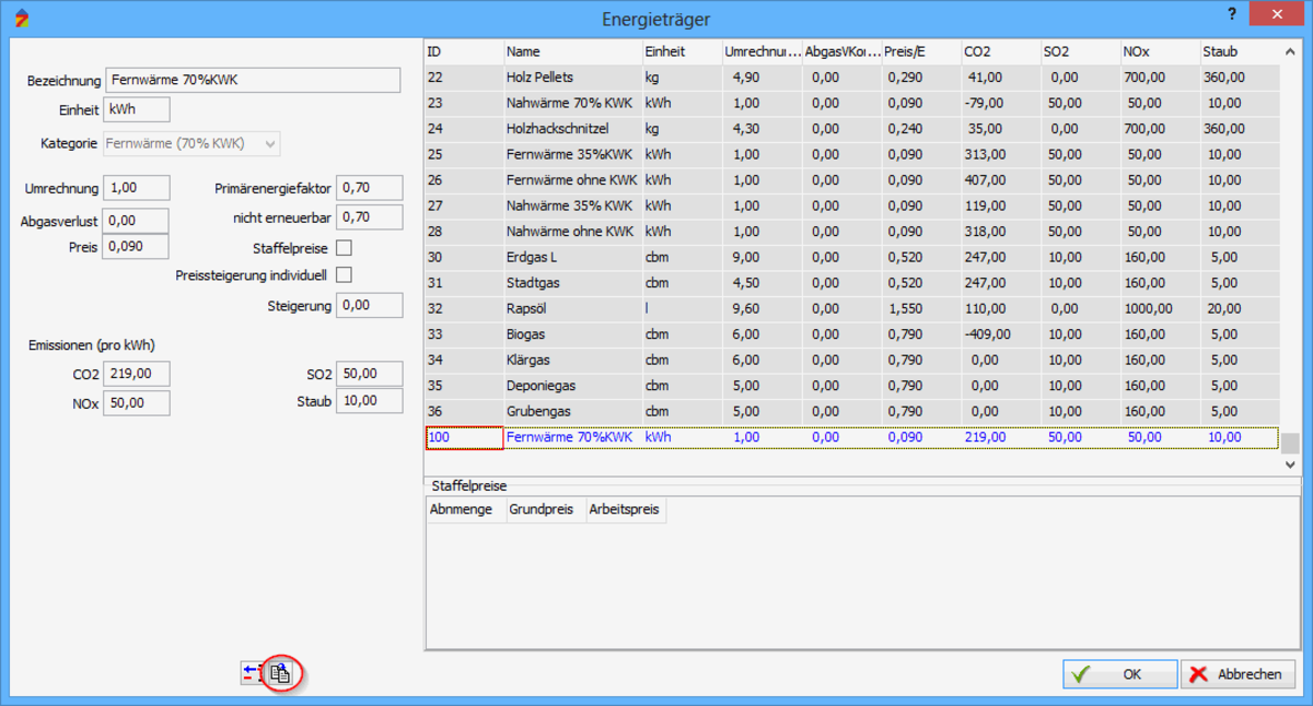 Sie können die Energieträgerdatenbank um weitere Energieträger erweitern. Dazu wird ein vorhandener Energieträger kopiert und angepasst.