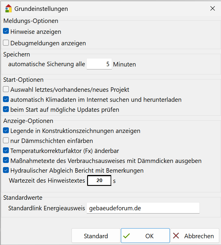 - Wählen Sie Grundeinstellungen aus dem Menü Extras, Einstellungen. Es erscheint folgende Dialogmaske: (siehe Bild)