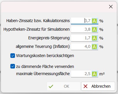 Hypotheken-Zinssatz für Simulationen: Der Hypotheken-Zinssatz wird im Programm ausschließlich für die grafische Darstellung der Wärmekostensimulation und die Berechnung des Zinsvorteils für KfW-Kredite verwendet.
