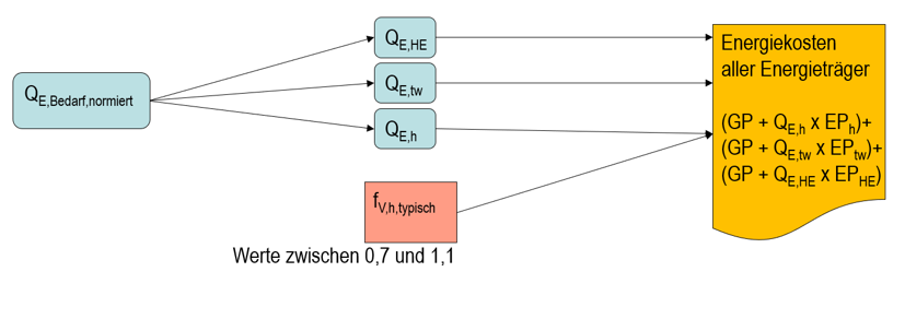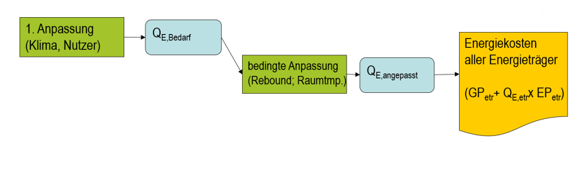 In EVEBI verändert sich die Berechnung nicht. Nach wie vor wird der Bedarf mit lokalem Klima und den Einstellungen des Nutzerverhaltens bzw. der Betriebsweise berücksichtigt. In den Maßnahmen können Randbedingungen verändert werden. Es gibt jedoch eine spezielle vereinfachte Möglichkeit, den Rebound-Effekt zu berücksichtigen (s.u.).