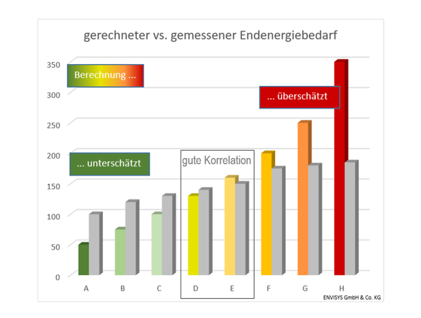 Der erfasste Verbrauch und der gerechnete Bedarf (immer als angepasst zu verstehen) sollten nicht mehr als 100% abweichen! In solchen Fällen sollte man zunächst die Dateneingabe überprüfen. Vielleicht sind ja manche Bauteile doch deutlich besser als die getroffenen Annahmen dies nahelegen. Verbleibt der Unterschied, so kann man auf dieser Basis keinen sinnvollen Abgleich vornehmen. Die Korrekturen der Randbedingungen wären unrealistisch. Hintergrund ist mit an Sicherheit grenzender Wahrscheinlichkeit eine extrem ungewöhnliche Nutzungs- oder Betriebsweise, die nicht für die Zukunft vorausgesetzt werden sollte. Abhilfe ist dann eine sachverständige Schätzung, die nicht deutlich von dem berechneten Bedarf abweicht.