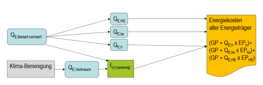 Eine besondere Form der Faktor Methode wird im iSFP-Handbuch beschrieben. Danach wird der Hilfsenergiebedarf und der Trinkwarmwasser-Endenergiebedarf normiert gerechnet und nicht verändert. Der Raumheizwärmebedarf wird über eine Klimabereinigung geschickt und damit ein Faktor ermittelt.