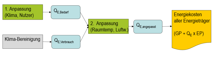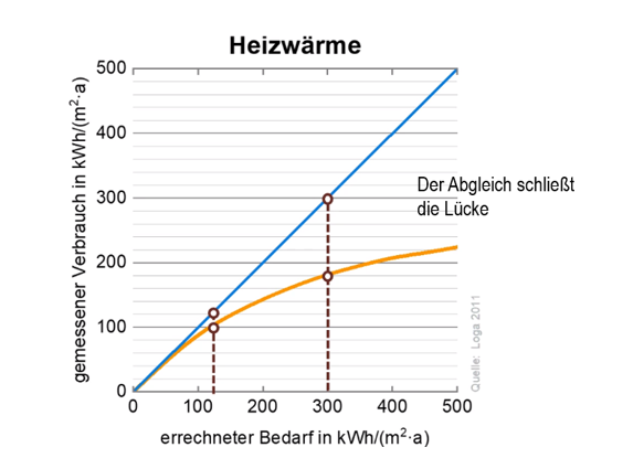 Wie zuvor beschrieben, kann das Modell in seinen Randbedingungen der lokalen Klimabedingungen, der Nutzung und der Betriebsweise so angepasst werden, dass Verbrauch und Bedarf in der angepassten Bilanz weitgehend übereinstimmen. Im individuellen Sanierungsfahrplan ist diese Anpassung vorgeschrieben. Dies kann verschieden erfolgen.