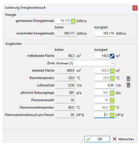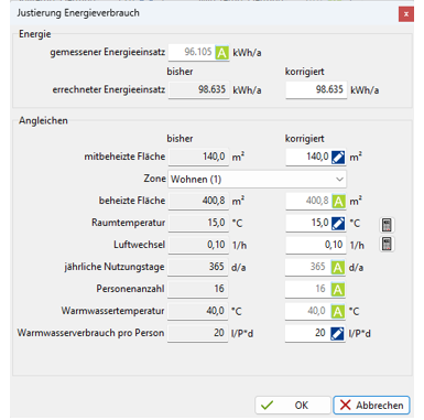 Sie wird als Solltemperatur Heizung in den Nutzungsparametern aufgeführt. Dieser Wert beeinflusst das Bilanzergebnis am Stärksten, was alle Studien zum Thema bestätigen. Darüber kann also der Verbrauchs-Bedarfs-Abgleich sehr wirkungsvoll geschehen. Welche Temperatur geeignet ist, den gemessenen Verbrauch zu „treffen“, kann man durch den Schalter (Taschenrechner-Symbol) herausfinden.