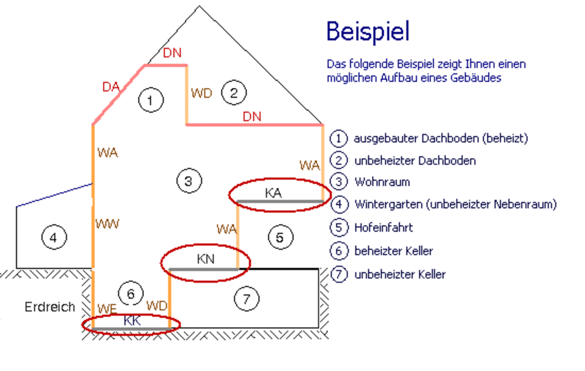 | Erdreich | Fußboden beheizter Keller | 0,17 | 0 | 0,6 | siehe 3) | KK | |