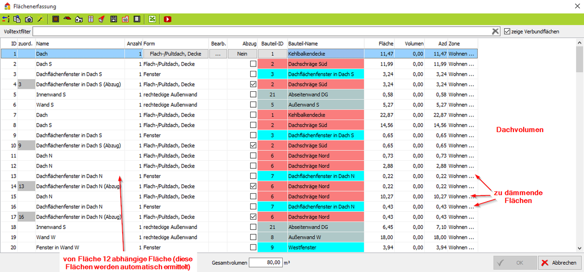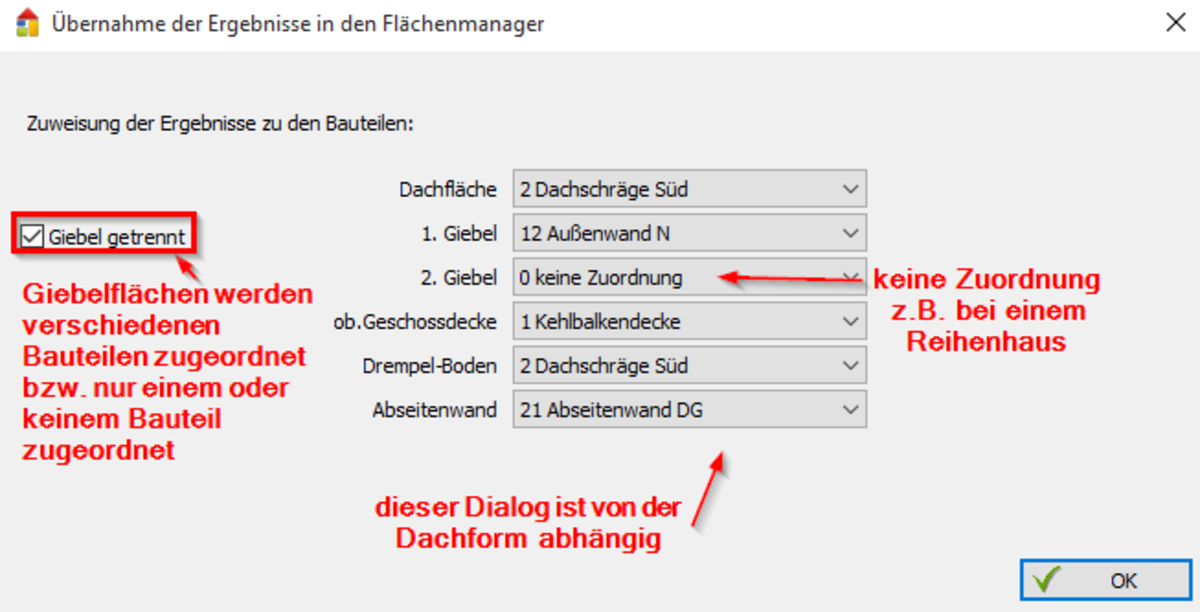 - Beim Verlassen des Flächenmanagers werden die Flächen den Bauteilen zugeordnet.