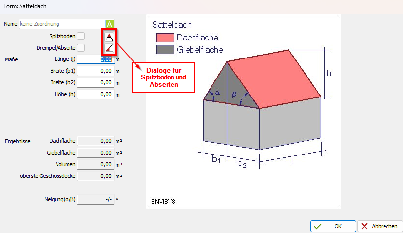 - Wählen Sie die gewünschte Dachform. Je nach Dachform erscheint ein Dialog zur Eingabe der Maße, z. B.: siehe Bild