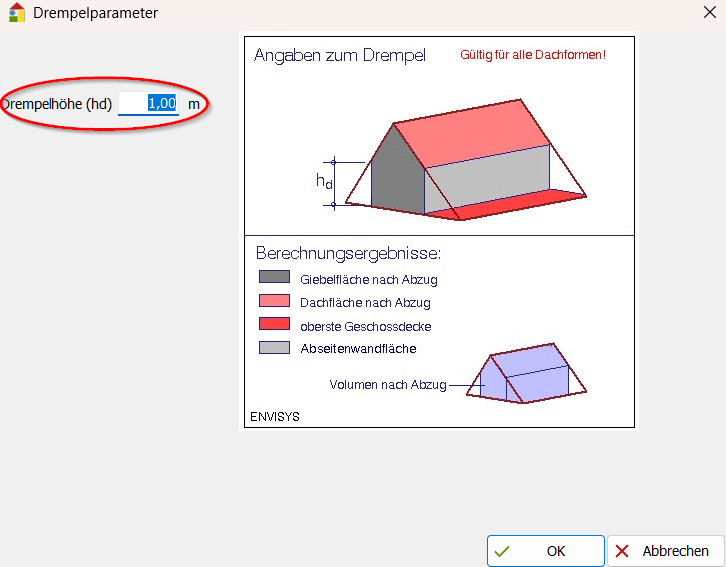 - Die zu dämmende Fläche kann von der wärmeübertragenden Fläche abweichen (z.B. Spitzboden, Drempel). Diese Fläche kann beim Erfassen von Dämm-Maßnahmen berücksichtigt werden.