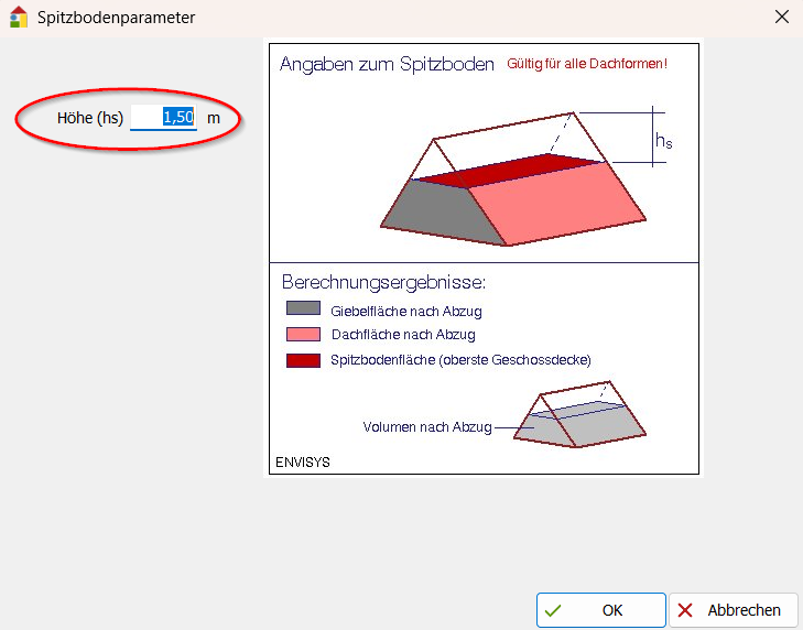 - Geben Sie die Maße ein. Die Angaben erfolgen in Meter! Hinweis: Ziehen Sie hier keine Flächen für Dachflächenfenster etc. ab. Diese Flächen werden beim Erfassen der Dachflächenfenster automatisch vom Dach abgezogen! Angaben zum Spitzboden**Klicken Sie dazu das Symbol
