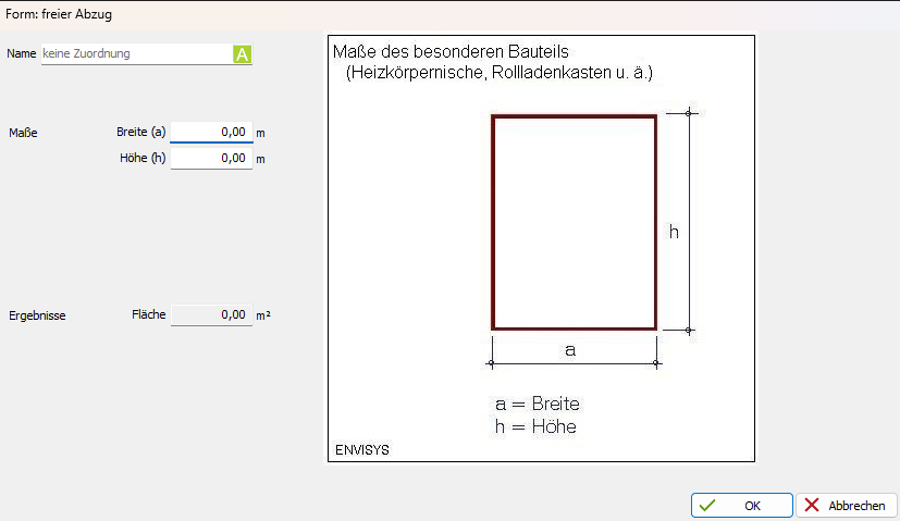Sie haben die Möglichkeit Flächen für besondere Bauteile im Flächenmanager zu erfassen. Damit können Sie bspw. Rollladenkästen und Heizköpernischen erfassen. Im Flächenmanager werden 2 Teilflächen angelegt (eine positive und eine Abzugsfläche).