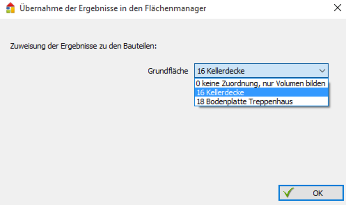 Hinweis zur Eingabe der Höhe: Hier sollte die Höhe ohne Dachberechnung eingegeben werden (z.B. bis zur Traufe). Es erscheint ein Dialog zur Auswahl des Kellerbauteils, dem die Fläche zugeordnet werden soll: Hier werden die Bauteile angezeigt, die Sie in der Bauteilmaske als Kellerbauteil definiert haben. Zusätzlich wird ein Eintrag 0 keine Zuordnung, nur Volumen bilden angeboten. Dieser Eintrag ermöglicht die ausschließliche Verwendung des Flächenmanager für die Volumenbildung (Es erfolgt keine Bauteilzuweisung!). Handelt es sich um ein zoniertes Gebäude, so wird in einem weiteren Dialog die Zone abgefragt, welcher das Volumen zugeordnet werden soll.
