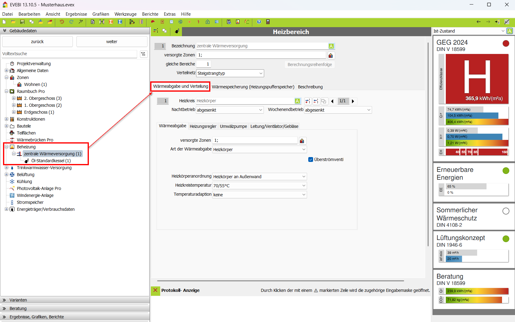 - Nachtabsenkung: Hier können Sie die Nachtabsenkung angeben. Diese wird für die Energieberatung nach LEG in die Berechnung einbezogen.