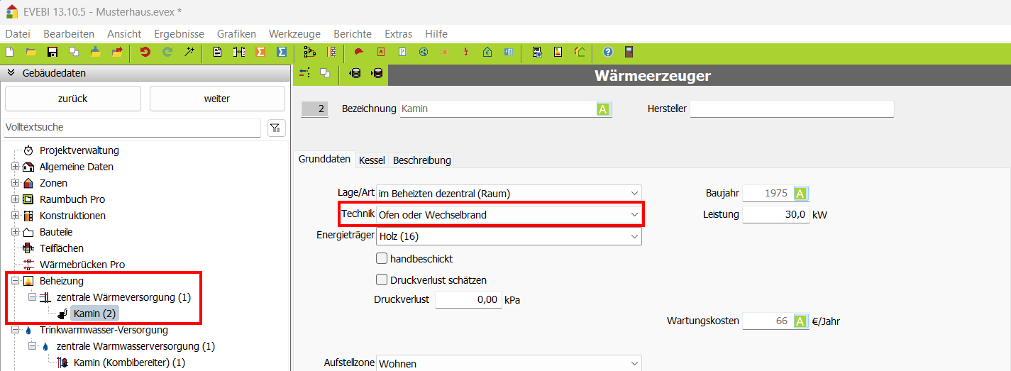 Hinweis: Bei Auswahl eines Einzelofens werden Daten zur Wärmeversorgung (Wärmeabgabe, Wärmeverteilung etc.) nicht in die Berechnung einbezogen!