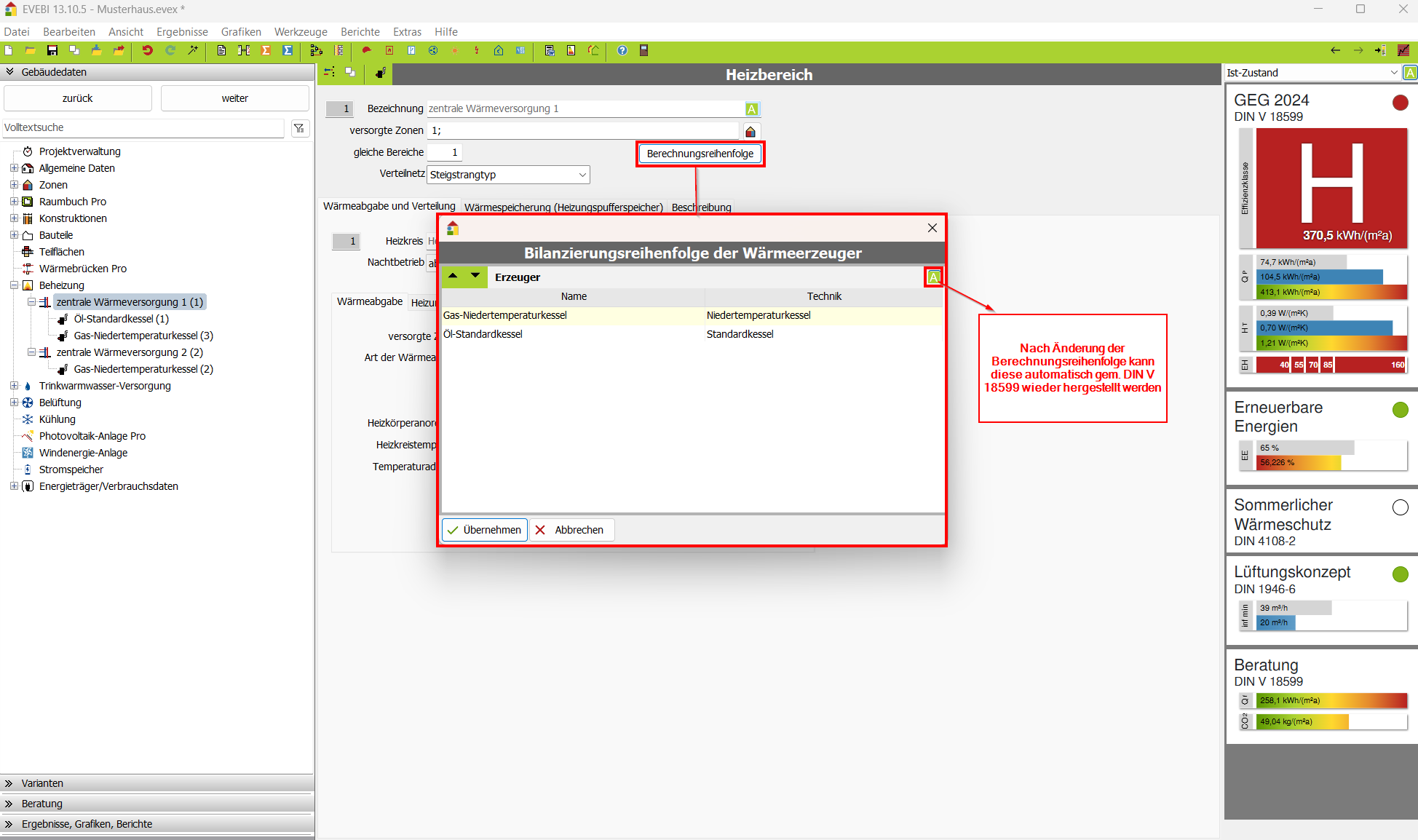 Standardmäßig wird bei mehreren Wärmeerzeugern die Berechnungsreihenfolge gem. DIN V 18599-5 6.5.4.2 hergestellt: