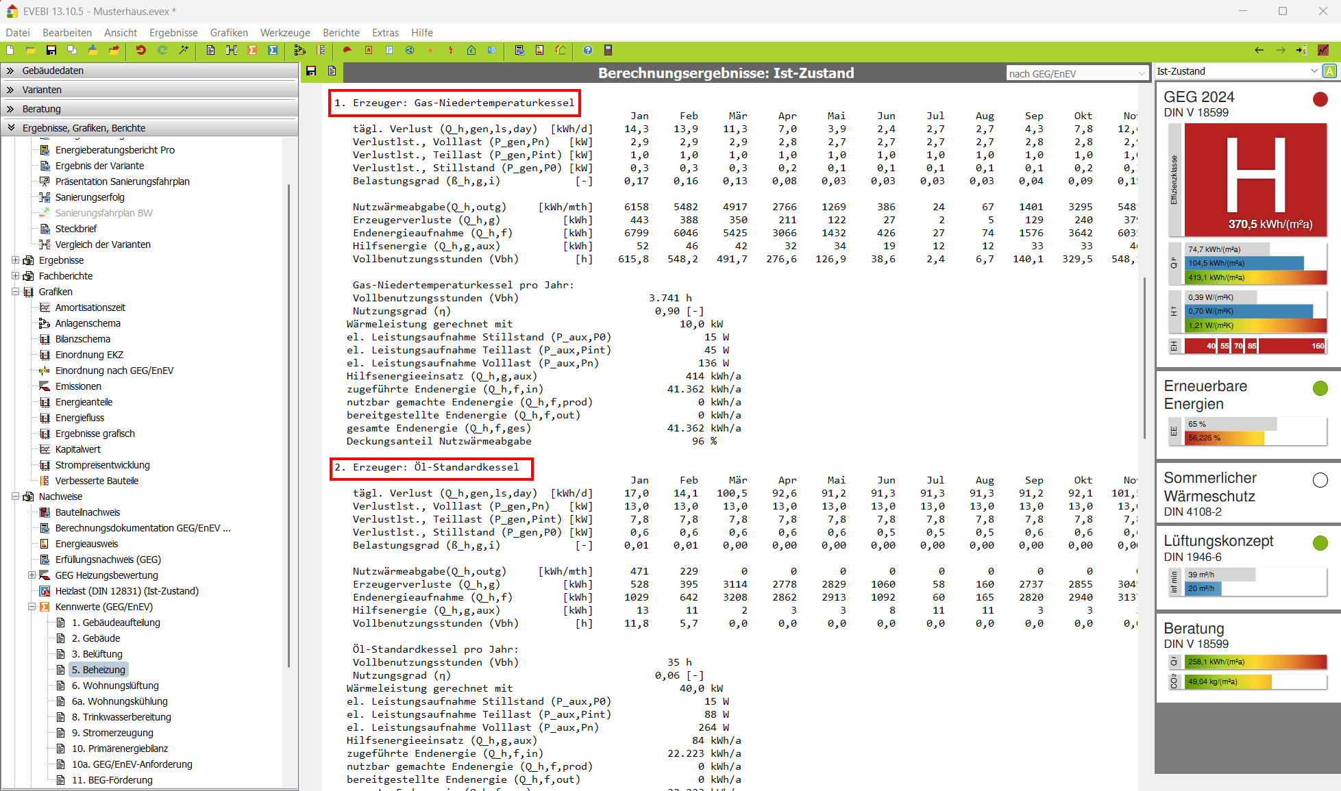 Die Berechnungsergebnisse können Sie über Ergebnisse, Kennwerte, Beheizung prüfen.