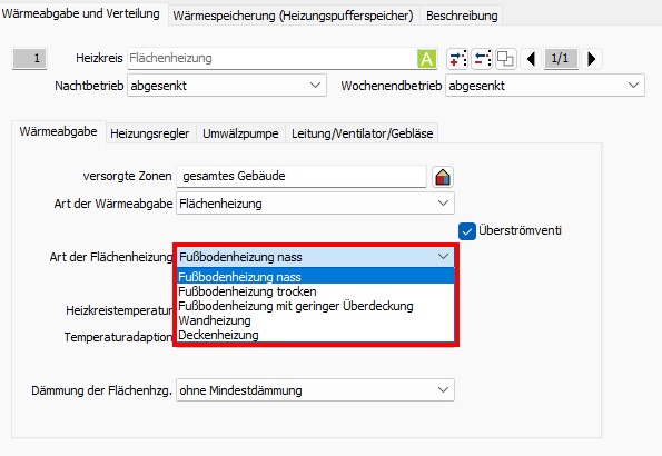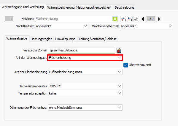 Wählen Sie unter Art der Wärmeabgabe: Flächenheizung.